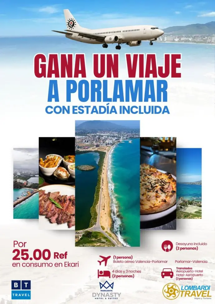En Ekari junto a nuestros aliados de @lombarditravels_vln @dinastyhotel1  @bttravelvzla estaremos rifando por un consumo mínimo de Ref 25 un viaje de ensueño a Porlamar 🏖️ con estadía incluida por 4 días y 3 noches, desayunos incluidos, boleto aéreo de ida y vuelta y traslados aeropuerto–hotel- aeropuerto